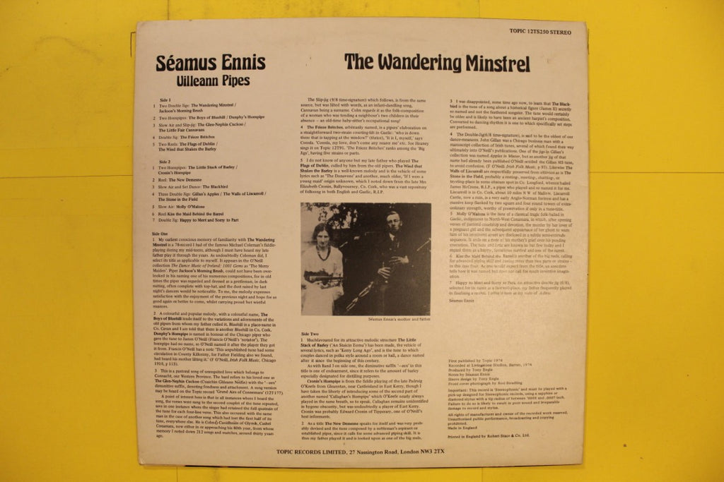 According to Goldmine rating standards, this record is in overall VG condition. The vinyl disc is rated VG+ and the sleeve is rated VG. A mint, or near mint copy of this disc may sell for $29 or more. Our price is $10.99. Additional Notes: Reissue, Blue Label, Matches discogs: https://www.discogs.com/release/8670206-Seamus-Ennis-The-Wandering-Minstrel