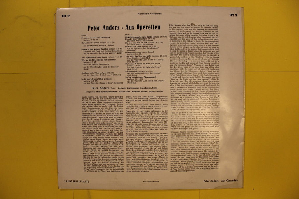 According to Goldmine rating standards, this record is in overall VG- condition. The vinyl disc is rated VG- and the sleeve is rated VG-. A mint, or near mint copy of this disc may sell for $9 or more. Our price is $2.49. Additional Notes: Unknown year pressing, Germany pressing, Matches discogs: https://www.discogs.com/release/2074267-Peter-Anders-Aus-Operetten-Historische-Aufnahmen-1934-1942